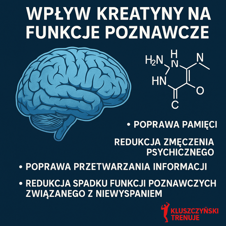 Kreatyna poprawia wydolność kognitywną poprzez zwiększenie dostępności ATP w tkance nerwowej. Największe korzyści odnotowuje się u osób starszych, osób na diecie roślinnej oraz w sytuacjach wzmożonego obciążenia energetycznego mózgu. Suplementacja kreatyną może wspierać pamięć krótkotrwałą, koncentrację i zdolność logicznego myślenia, co ma szczególne znaczenie dla zawodników, osób pracujących umysłowo oraz wszystkich dbających o zdrowie mózgu.